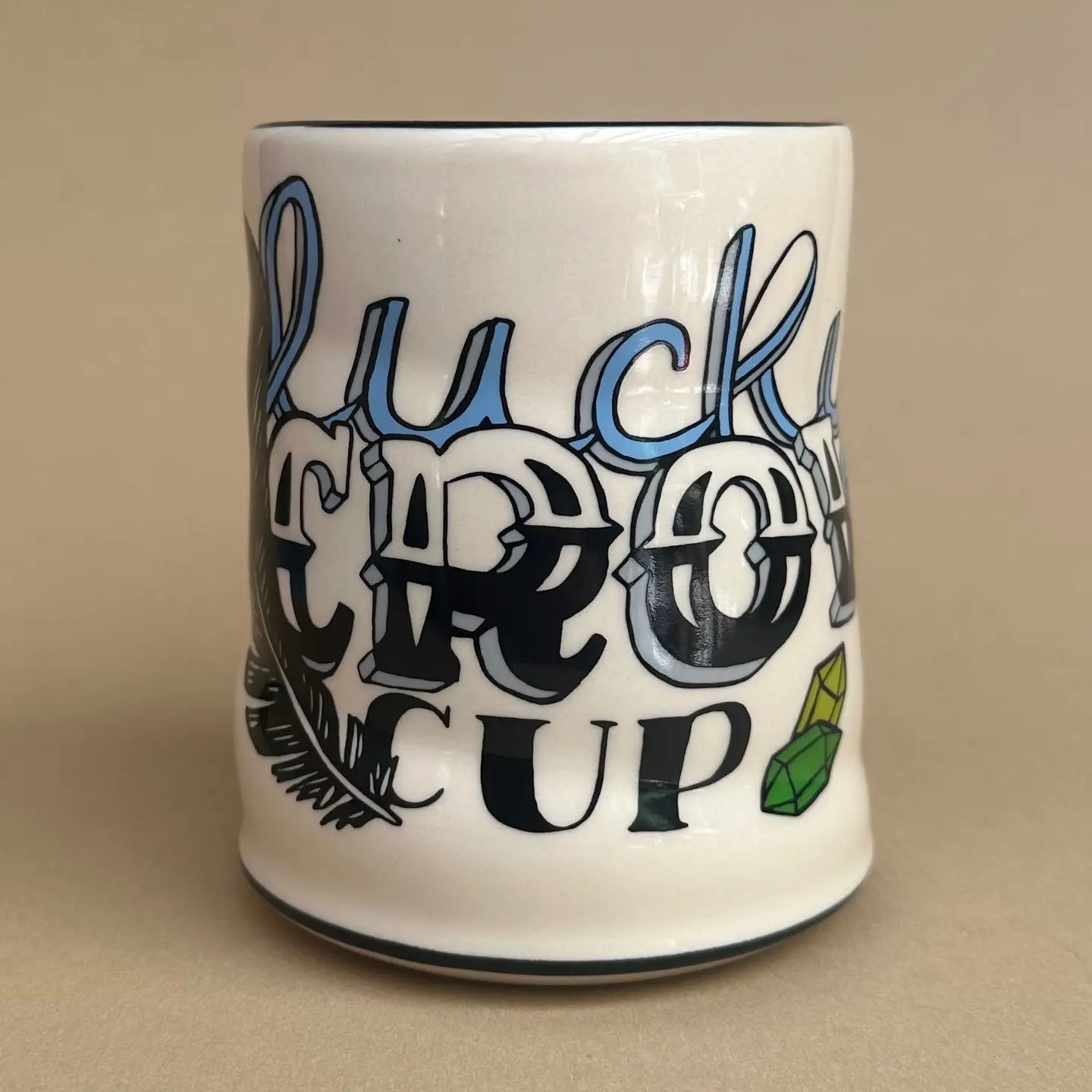 • Lucky Crow Cup • Size: XLarge (16 fl. oz.) • Ceramic • Measures diameter 3 1/4” height 4 1/4” • Art on all sides. • Comfortable to hold with a unique thumb divot. Like prints of a painting, the cups that make up my “Lucky Cup Line” are faithful reproductions of my originals. Designed in my Washington State studio, made in Thailand in a facility meets European standards for people and planet.